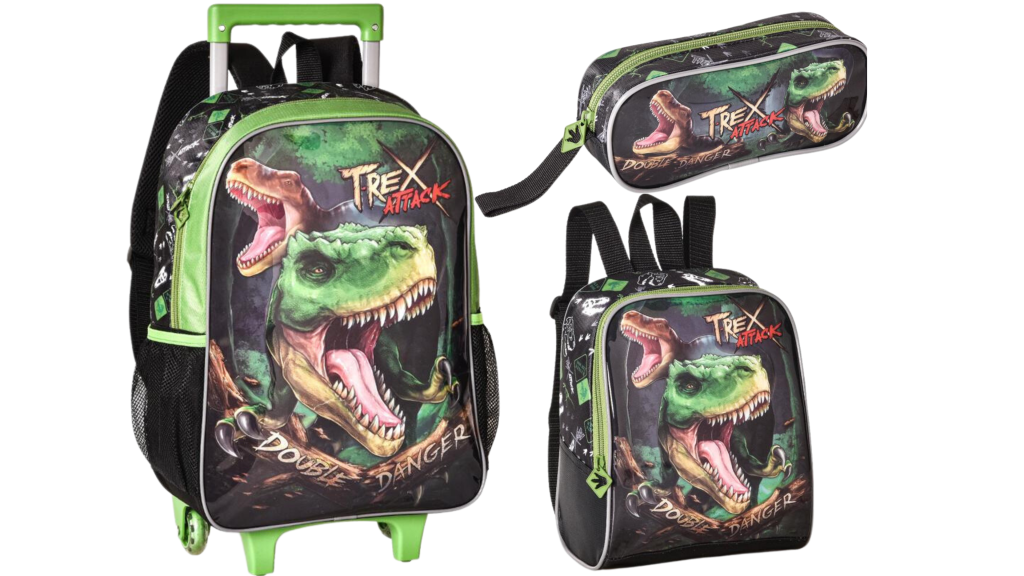 | Nome do Produto | : | 3460 KIT - MOCHILA RODINHA C/ ALÇA + LANCHEIRA + ESTOJO - TREX ATTACK - CLIO |